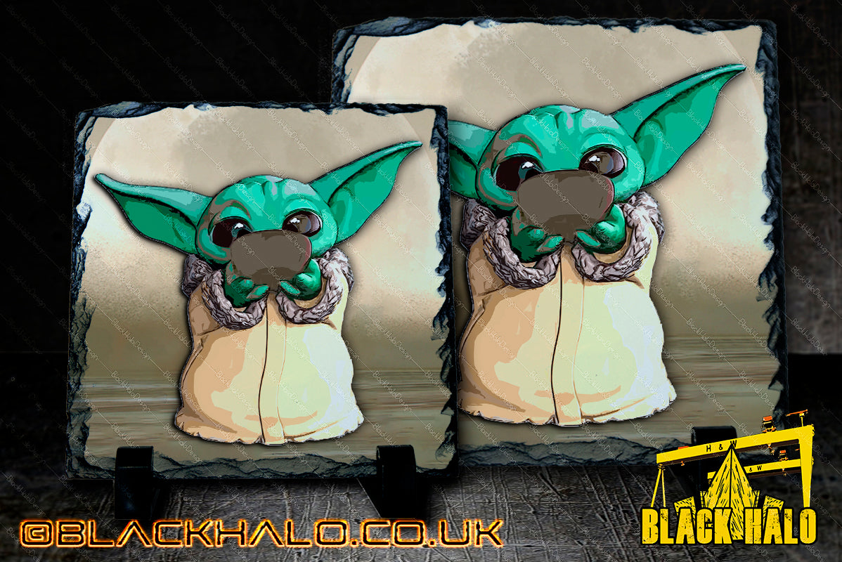 Star Wars Baby Yoda inspired artwork on Natural Causeway Rock Slate with Stands