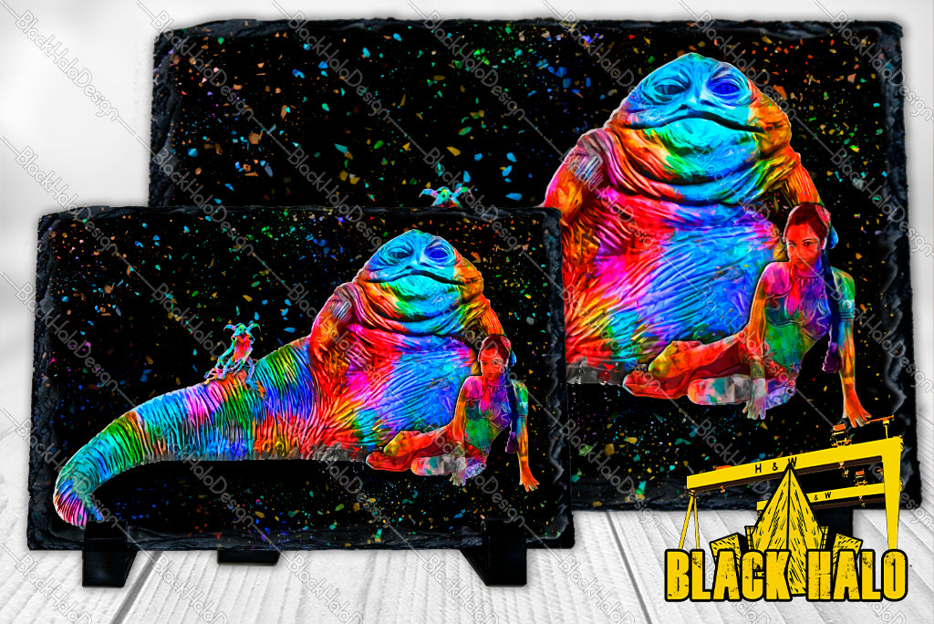 Star Wars Inspired Jabba the Hutt & Slave Leia artwork on Natural Rock Slate with Stands