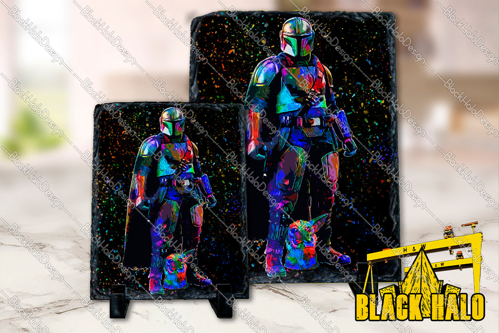 Star Wars Inspired The Mandalorian and Baby Yoda artwork on Natural Rock Slate with Stands