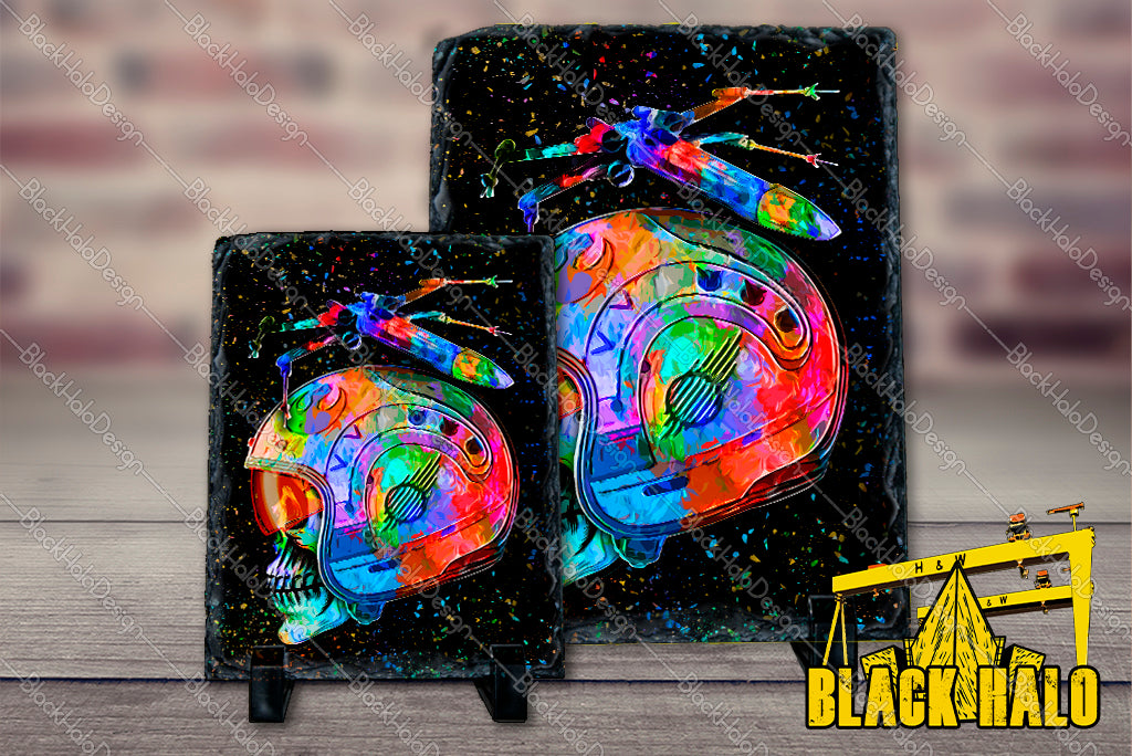 Star Wars Inspired X-Wing Pilot Skull artwork on Natural Rock Slate with Stands