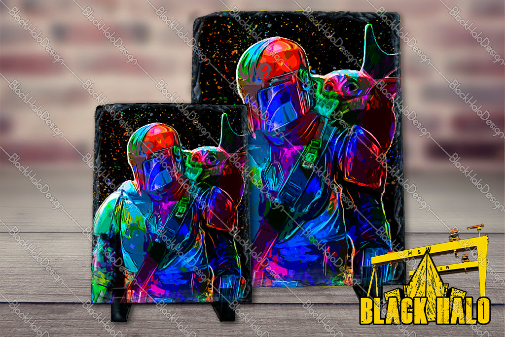 Star Wars The Mandalorian Inspired artwork on Natural Rock Slate with Stands